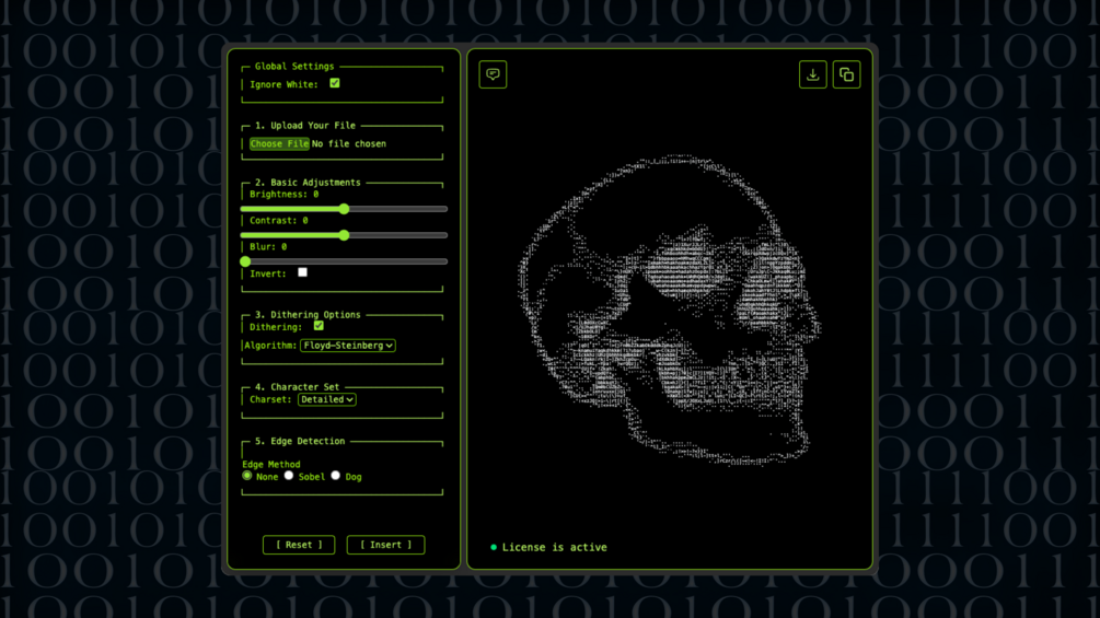- Upload any image (JPG/PNG) or paste a URL and instantly see it in ASCII form.